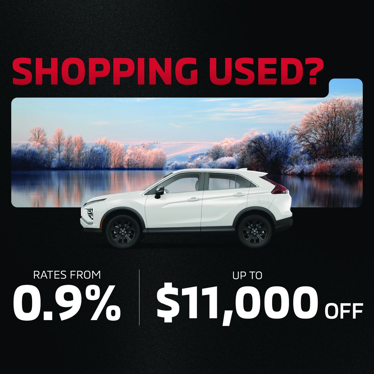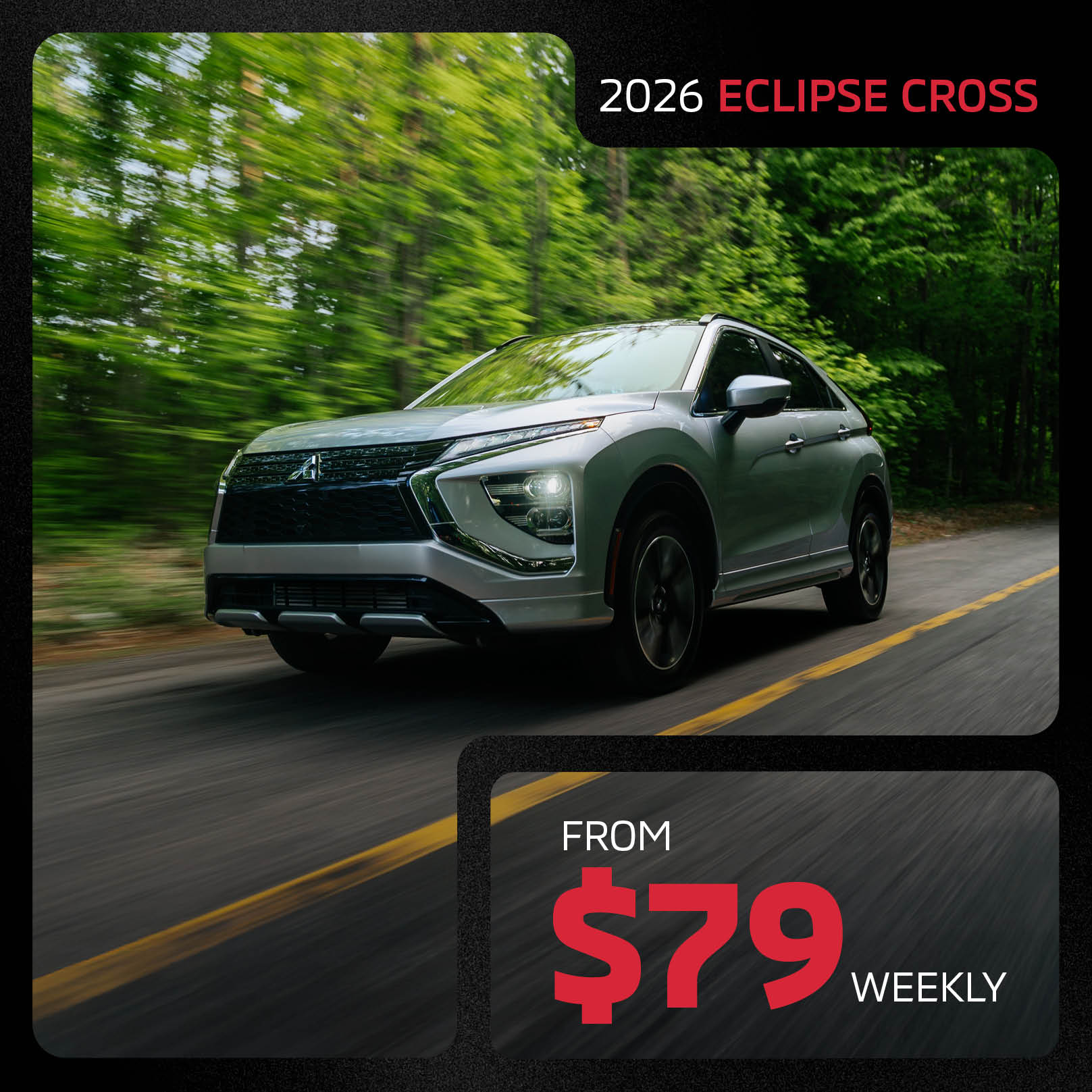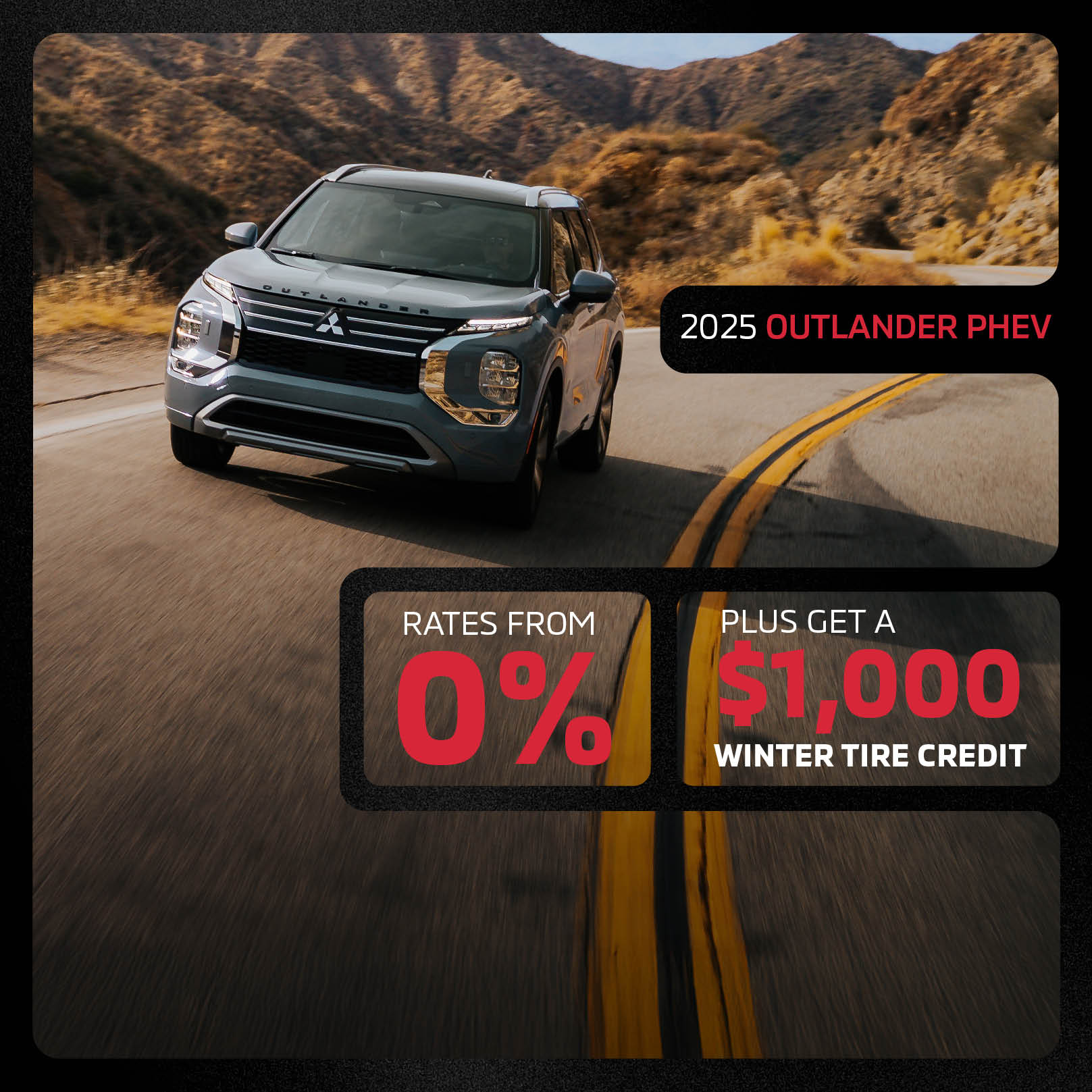 Dealer #50259. All offers OAC. Vehicles available on a FCFS basis. $1,000 Winter Tire Credit Valid on new vehicles Financed or Leased through MMSCAN only, see dealer for details. Payment from $79.00 + tax weekly applies to 2026 Eclipse Cross stk# 26EC0724 leased at 3.99% for 36 months with $1,599 down. Total lease obligation is $13,855.14. 16,000-kilometre allowance; charge of $0.10/km for excess kilometres. Rates from 0% apply to select New, In-stock 2025 Outlander and Outlander PHEV models. Up to $11,000 off applies to stk#25PH5626A. Test drive contest is 1 entry per customer, with valid test drive before November 30th 2025. Up to $2,500 in savings applies to new in-stock 2025 RVR models purchased in cash. Rates from 0.9% applies to select certified pre owned Mitsubishi models. Eligibility is dependent on dealer discretion. Some conditions apply. See dealer for details. Subject to change without notice. Offers expires November 30, 2025.